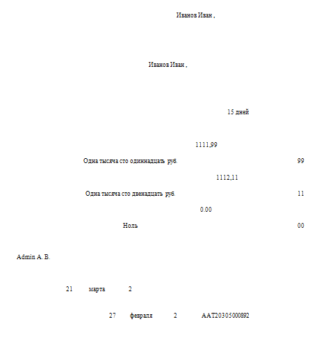 Существует также шаблон отчета для печати на заранее приготовленных бланках, содержащий только динамическую информацию. Ниже приведен пример отображения отчета по данного шаблону: